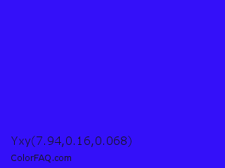 Yxy 7.94,0.16,0.068 Color is a normal indigo color and the nearest color is Electric Ultramarine #3f00ff. Hex code #3410f9 and RGB value is rgb(52,16,249). In RGB color space, this color is composed of 20% red, 6% green, 98% blue, In CMYK color space, this color is composed of 79% cyan, 94% magenta, 0% yellow , 2% black , In HSL color space, this color has a hue angle of 249° , 95% saturation and 52% lightness.
