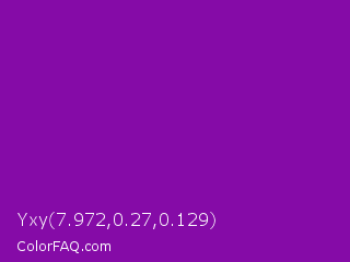 Yxy 7.972,0.27,0.129 Color is a normal purple color and the nearest color is Violet RYB #8601af. Hex code #850ba7 and RGB value is rgb(133,11,167). In RGB color space, this color is composed of 52% red, 4% green, 65% blue, In CMYK color space, this color is composed of 20% cyan, 93% magenta, 0% yellow , 35% black , In HSL color space, this color has a hue angle of 287° , 88% saturation and 35% lightness.