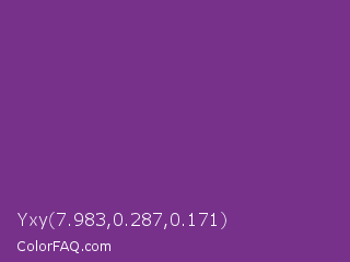 Yxy 7.983,0.287,0.171 Color is a normal purple color and the nearest color is Maximum Purple #733380. Hex code #77318b and RGB value is rgb(119,49,139). In RGB color space, this color is composed of 47% red, 19% green, 55% blue, In CMYK color space, this color is composed of 14% cyan, 65% magenta, 0% yellow , 45% black , In HSL color space, this color has a hue angle of 287° , 48% saturation and 37% lightness.