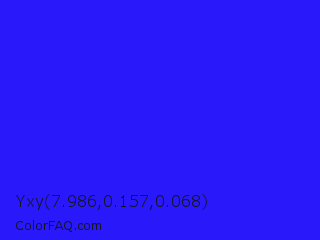 Yxy 7.986,0.157,0.068 Color is a normal indigo color and the nearest color is Bluebonnet #1c1cf0. Hex code #2818fa and RGB value is rgb(40,24,250). In RGB color space, this color is composed of 16% red, 9% green, 98% blue, In CMYK color space, this color is composed of 84% cyan, 90% magenta, 0% yellow , 2% black , In HSL color space, this color has a hue angle of 244° , 96% saturation and 54% lightness.