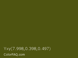 Yxy 7.998,0.398,0.497 Color is a very dark yellow color and the nearest color is Saratoga #555b10. Hex code #4e5410 and RGB value is rgb(78,84,16). In RGB color space, this color is composed of 31% red, 33% green, 6% blue, In CMYK color space, this color is composed of 7% cyan, 0% magenta, 81% yellow , 67% black , In HSL color space, this color has a hue angle of 65° , 68% saturation and 20% lightness.