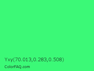 Yxy 70.013,0.283,0.508 Color is a normal green color and the nearest color is UFO Green #3cd070. Hex code #3bf977 and RGB value is rgb(59,249,119). In RGB color space, this color is composed of 23% red, 98% green, 47% blue, In CMYK color space, this color is composed of 76% cyan, 0% magenta, 52% yellow , 2% black , In HSL color space, this color has a hue angle of 139° , 94% saturation and 60% lightness.