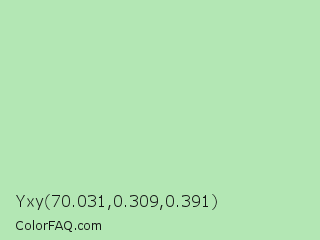 Yxy 70.031,0.309,0.391 Color is a light green color and the nearest color is Celadon #ace1af. Hex code #b3e7b4 and RGB value is rgb(179,231,180). In RGB color space, this color is composed of 70% red, 91% green, 71% blue, In CMYK color space, this color is composed of 23% cyan, 0% magenta, 22% yellow , 9% black , In HSL color space, this color has a hue angle of 121° , 52% saturation and 80% lightness.