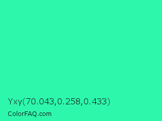 Yxy 70.043,0.258,0.433 Color is a normal green color and the nearest color is Eucalyptus #44d7a8. Hex code #2df7ab and RGB value is rgb(45,247,171). In RGB color space, this color is composed of 18% red, 97% green, 67% blue, In CMYK color space, this color is composed of 82% cyan, 0% magenta, 31% yellow , 3% black , In HSL color space, this color has a hue angle of 157° , 93% saturation and 57% lightness.