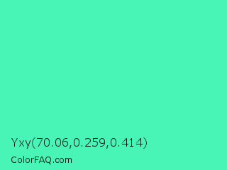 Yxy 70.06,0.259,0.414 Color is a light green color and the nearest color is Eucalyptus #44d7a8. Hex code #49f5b6 and RGB value is rgb(73,245,182). In RGB color space, this color is composed of 29% red, 96% green, 71% blue, In CMYK color space, this color is composed of 70% cyan, 0% magenta, 26% yellow , 4% black , In HSL color space, this color has a hue angle of 158° , 90% saturation and 62% lightness.