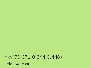 Yxy 70.071,0.344,0.448 Color is a light green color and the nearest color is Sulu #c1f07c. Hex code #bce884 and RGB value is rgb(188,232,132). In RGB color space, this color is composed of 74% red, 91% green, 52% blue, In CMYK color space, this color is composed of 19% cyan, 0% magenta, 43% yellow , 9% black , In HSL color space, this color has a hue angle of 86° , 68% saturation and 71% lightness.