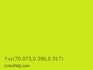 Yxy 70.073,0.396,0.517 Color is a normal yellow color and the nearest color is Las Palmas #c6e610. Hex code #cce71c and RGB value is rgb(204,231,28). In RGB color space, this color is composed of 80% red, 91% green, 11% blue, In CMYK color space, this color is composed of 12% cyan, 0% magenta, 88% yellow , 9% black , In HSL color space, this color has a hue angle of 68° , 81% saturation and 51% lightness.