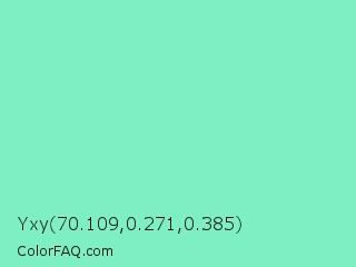 Yxy 70.109,0.271,0.385 Color is a light green color and the nearest color is Bermuda #7dd8c6. Hex code #7eefc3 and RGB value is rgb(126,239,195). In RGB color space, this color is composed of 49% red, 94% green, 76% blue, In CMYK color space, this color is composed of 47% cyan, 0% magenta, 18% yellow , 6% black , In HSL color space, this color has a hue angle of 157° , 78% saturation and 72% lightness.