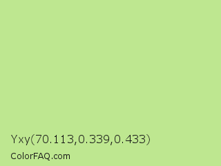 Yxy 70.113,0.339,0.433 Color is a light green color and the nearest color is Medium Spring Bud #c9dc87. Hex code #bee790 and RGB value is rgb(190,231,144). In RGB color space, this color is composed of 75% red, 91% green, 56% blue, In CMYK color space, this color is composed of 18% cyan, 0% magenta, 38% yellow , 9% black , In HSL color space, this color has a hue angle of 88° , 64% saturation and 74% lightness.