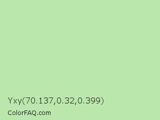 Yxy 70.137,0.32,0.399 Color is a light green color and the nearest color is Moss Green #addfad. Hex code #bbe6ac and RGB value is rgb(187,230,172). In RGB color space, this color is composed of 73% red, 90% green, 67% blue, In CMYK color space, this color is composed of 19% cyan, 0% magenta, 25% yellow , 10% black , In HSL color space, this color has a hue angle of 104° , 54% saturation and 79% lightness.