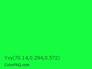 Yxy 70.14,0.294,0.572 Color is a normal green color and the nearest color is Malachite #0bda51. Hex code #16fc40 and RGB value is rgb(22,252,64). In RGB color space, this color is composed of 9% red, 99% green, 25% blue, In CMYK color space, this color is composed of 91% cyan, 0% magenta, 75% yellow , 1% black , In HSL color space, this color has a hue angle of 131° , 97% saturation and 54% lightness.