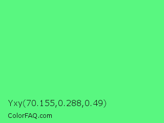 Yxy 70.155,0.288,0.49 Color is a light green color and the nearest color is Very Light Malachite Green #64e986. Hex code #59f780 and RGB value is rgb(89,247,128). In RGB color space, this color is composed of 35% red, 97% green, 50% blue, In CMYK color space, this color is composed of 64% cyan, 0% magenta, 48% yellow , 3% black , In HSL color space, this color has a hue angle of 135° , 91% saturation and 66% lightness.