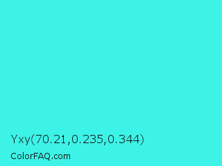 Yxy 70.21,0.235,0.344 Color is a normal cyan color and the nearest color is Turquoise #40e0d0. Hex code #3df2e6 and RGB value is rgb(61,242,230). In RGB color space, this color is composed of 24% red, 95% green, 90% blue, In CMYK color space, this color is composed of 75% cyan, 0% magenta, 5% yellow , 5% black , In HSL color space, this color has a hue angle of 176° , 87% saturation and 59% lightness.