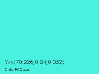 Yxy 70.226,0.24,0.352 Color is a light cyan color and the nearest color is Turquoise #40e0d0. Hex code #49f2e0 and RGB value is rgb(73,242,224). In RGB color space, this color is composed of 29% red, 95% green, 88% blue, In CMYK color space, this color is composed of 70% cyan, 0% magenta, 7% yellow , 5% black , In HSL color space, this color has a hue angle of 174° , 87% saturation and 62% lightness.