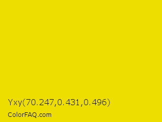 Yxy 70.247,0.431,0.496 Color is a normal yellow color and the nearest color is Titanium Yellow #eee600. Hex code #edde00 and RGB value is rgb(237,222,0). In RGB color space, this color is composed of 93% red, 87% green, 0% blue, In CMYK color space, this color is composed of 0% cyan, 6% magenta, 100% yellow , 7% black , In HSL color space, this color has a hue angle of 56° , 100% saturation and 46% lightness.