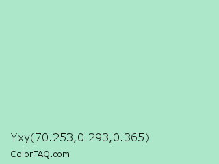 Yxy 70.253,0.293,0.365 Color is a light green color and the nearest color is Padua #ade6c4. Hex code #ade7c9 and RGB value is rgb(173,231,201). In RGB color space, this color is composed of 68% red, 91% green, 79% blue, In CMYK color space, this color is composed of 25% cyan, 0% magenta, 13% yellow , 9% black , In HSL color space, this color has a hue angle of 149° , 55% saturation and 79% lightness.