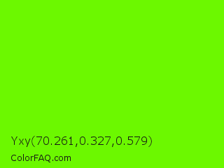 Yxy 70.261,0.327,0.579 Color is a normal green color and the nearest color is Bright Green #66ff00. Hex code #6cf800 and RGB value is rgb(108,248,0). In RGB color space, this color is composed of 42% red, 97% green, 0% blue, In CMYK color space, this color is composed of 56% cyan, 0% magenta, 100% yellow , 3% black , In HSL color space, this color has a hue angle of 94° , 100% saturation and 49% lightness.