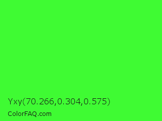 Yxy 70.266,0.304,0.575 Color is a normal green color and the nearest color is Neon Green #39ff14. Hex code #3ffb33 and RGB value is rgb(63,251,51). In RGB color space, this color is composed of 25% red, 98% green, 20% blue, In CMYK color space, this color is composed of 75% cyan, 0% magenta, 80% yellow , 2% black , In HSL color space, this color has a hue angle of 116° , 96% saturation and 59% lightness.