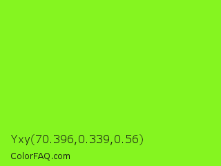 Yxy 70.396,0.339,0.56 Color is a normal green color and the nearest color is Spring Frost #87ff2a. Hex code #85f520 and RGB value is rgb(133,245,32). In RGB color space, this color is composed of 52% red, 96% green, 13% blue, In CMYK color space, this color is composed of 46% cyan, 0% magenta, 87% yellow , 4% black , In HSL color space, this color has a hue angle of 92° , 91% saturation and 54% lightness.