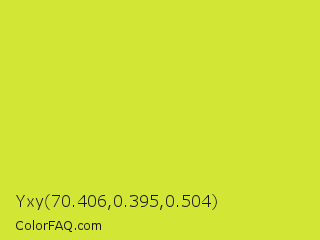 Yxy 70.406,0.395,0.504 Color is a normal yellow color and the nearest color is Pear #d1e231. Hex code #d1e635 and RGB value is rgb(209,230,53). In RGB color space, this color is composed of 82% red, 90% green, 21% blue, In CMYK color space, this color is composed of 9% cyan, 0% magenta, 77% yellow , 10% black , In HSL color space, this color has a hue angle of 67° , 78% saturation and 55% lightness.