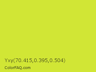 Yxy 70.415,0.395,0.504 Color is a normal yellow color and the nearest color is Pear #d1e231. Hex code #d1e635 and RGB value is rgb(209,230,53). In RGB color space, this color is composed of 82% red, 90% green, 21% blue, In CMYK color space, this color is composed of 9% cyan, 0% magenta, 77% yellow , 10% black , In HSL color space, this color has a hue angle of 67° , 78% saturation and 55% lightness.