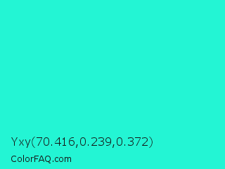 Yxy 70.416,0.239,0.372 Color is a normal cyan color and the nearest color is Bright Turquoise #08e8de. Hex code #23f5d4 and RGB value is rgb(35,245,212). In RGB color space, this color is composed of 14% red, 96% green, 83% blue, In CMYK color space, this color is composed of 86% cyan, 0% magenta, 13% yellow , 4% black , In HSL color space, this color has a hue angle of 171° , 91% saturation and 55% lightness.