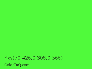Yxy 70.426,0.308,0.566 Color is a light green color and the nearest color is Neon Green #39ff14. Hex code #50fa3b and RGB value is rgb(80,250,59). In RGB color space, this color is composed of 31% red, 98% green, 23% blue, In CMYK color space, this color is composed of 68% cyan, 0% magenta, 76% yellow , 2% black , In HSL color space, this color has a hue angle of 113° , 95% saturation and 61% lightness.