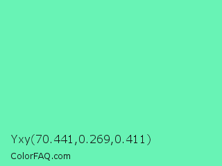 Yxy 70.441,0.269,0.411 Color is a light green color and the nearest color is Medium Aquamarine #66ddaa. Hex code #68f3b5 and RGB value is rgb(104,243,181). In RGB color space, this color is composed of 41% red, 95% green, 71% blue, In CMYK color space, this color is composed of 57% cyan, 0% magenta, 26% yellow , 5% black , In HSL color space, this color has a hue angle of 153° , 85% saturation and 68% lightness.