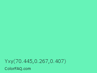 Yxy 70.445,0.267,0.407 Color is a light green color and the nearest color is Medium Aquamarine #66ddaa. Hex code #66f3b8 and RGB value is rgb(102,243,184). In RGB color space, this color is composed of 40% red, 95% green, 72% blue, In CMYK color space, this color is composed of 58% cyan, 0% magenta, 24% yellow , 5% black , In HSL color space, this color has a hue angle of 155° , 85% saturation and 68% lightness.