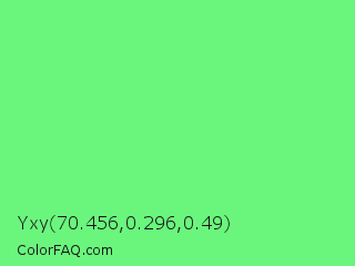 Yxy 70.456,0.296,0.49 Color is a light green color and the nearest color is Very Light Malachite Green #64e986. Hex code #6af67d and RGB value is rgb(106,246,125). In RGB color space, this color is composed of 42% red, 96% green, 49% blue, In CMYK color space, this color is composed of 57% cyan, 0% magenta, 49% yellow , 4% black , In HSL color space, this color has a hue angle of 128° , 89% saturation and 69% lightness.