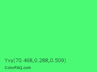 Yxy 70.468,0.288,0.509 Color is a light green color and the nearest color is Screamin Green #66ff66. Hex code #4af974 and RGB value is rgb(74,249,116). In RGB color space, this color is composed of 29% red, 98% green, 45% blue, In CMYK color space, this color is composed of 70% cyan, 0% magenta, 53% yellow , 2% black , In HSL color space, this color has a hue angle of 134° , 94% saturation and 63% lightness.