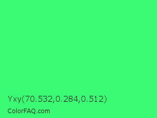 Yxy 70.532,0.284,0.512 Color is a light green color and the nearest color is UFO Green #3cd070. Hex code #3bfa74 and RGB value is rgb(59,250,116). In RGB color space, this color is composed of 23% red, 98% green, 45% blue, In CMYK color space, this color is composed of 76% cyan, 0% magenta, 54% yellow , 2% black , In HSL color space, this color has a hue angle of 138° , 95% saturation and 61% lightness.