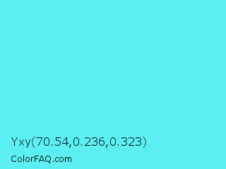 Yxy 70.54,0.236,0.323 Color is a light cyan color and the nearest color is Turquoise Blue #6cdae7. Hex code #5beff4 and RGB value is rgb(91,239,244). In RGB color space, this color is composed of 36% red, 94% green, 96% blue, In CMYK color space, this color is composed of 63% cyan, 2% magenta, 0% yellow , 4% black , In HSL color space, this color has a hue angle of 182° , 87% saturation and 66% lightness.
