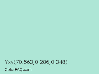 Yxy 70.563,0.286,0.348 Color is a light green color and the nearest color is Magic Mint #aaf0d1. Hex code #aee6d6 and RGB value is rgb(174,230,214). In RGB color space, this color is composed of 68% red, 90% green, 84% blue, In CMYK color space, this color is composed of 24% cyan, 0% magenta, 7% yellow , 10% black , In HSL color space, this color has a hue angle of 163° , 53% saturation and 79% lightness.