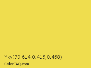 Yxy 70.614,0.416,0.468 Color is a light yellow color and the nearest color is Minion Yellow #f5e050. Hex code #efdd4e and RGB value is rgb(239,221,78). In RGB color space, this color is composed of 94% red, 87% green, 31% blue, In CMYK color space, this color is composed of 0% cyan, 8% magenta, 67% yellow , 6% black , In HSL color space, this color has a hue angle of 53° , 83% saturation and 62% lightness.