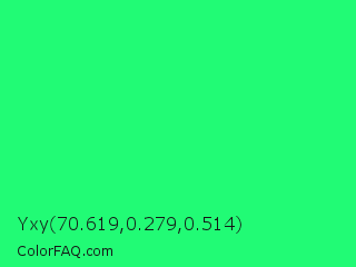 Yxy 70.619,0.279,0.514 Color is a normal green color and the nearest color is Spring Green #00ff7f. Hex code #21fb75 and RGB value is rgb(33,251,117). In RGB color space, this color is composed of 13% red, 98% green, 46% blue, In CMYK color space, this color is composed of 87% cyan, 0% magenta, 53% yellow , 2% black , In HSL color space, this color has a hue angle of 143° , 96% saturation and 56% lightness.