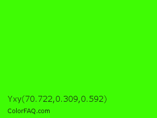 Yxy 70.722,0.309,0.592 Color is a normal green color and the nearest color is Harlequin #3fff00. Hex code #3ffc04 and RGB value is rgb(63,252,4). In RGB color space, this color is composed of 25% red, 99% green, 2% blue, In CMYK color space, this color is composed of 75% cyan, 0% magenta, 98% yellow , 1% black , In HSL color space, this color has a hue angle of 106° , 98% saturation and 50% lightness.