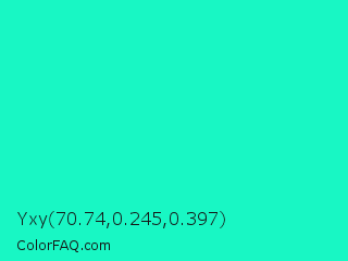 Yxy 70.74,0.245,0.397 Color is a normal cyan color and the nearest color is Bright Turquoise #08e8de. Hex code #18f7c4 and RGB value is rgb(24,247,196). In RGB color space, this color is composed of 9% red, 97% green, 77% blue, In CMYK color space, this color is composed of 90% cyan, 0% magenta, 21% yellow , 3% black , In HSL color space, this color has a hue angle of 166° , 93% saturation and 53% lightness.