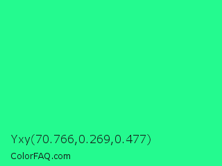 Yxy 70.766,0.269,0.477 Color is a normal green color and the nearest color is Medium Spring Green #00fa9a. Hex code #24fa8f and RGB value is rgb(36,250,143). In RGB color space, this color is composed of 14% red, 98% green, 56% blue, In CMYK color space, this color is composed of 86% cyan, 0% magenta, 43% yellow , 2% black , In HSL color space, this color has a hue angle of 150° , 96% saturation and 56% lightness.