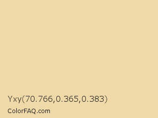 Yxy 70.766,0.365,0.383 Color is a light orange color and the nearest color is Maize #f5d5a0. Hex code #efd9a7 and RGB value is rgb(239,217,167). In RGB color space, this color is composed of 94% red, 85% green, 65% blue, In CMYK color space, this color is composed of 0% cyan, 9% magenta, 30% yellow , 6% black , In HSL color space, this color has a hue angle of 42° , 69% saturation and 80% lightness.
