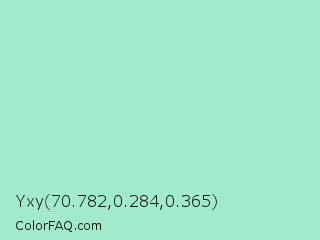 Yxy 70.782,0.284,0.365 Color is a light green color and the nearest color is Magic Mint #aaf0d1. Hex code #a1eacc and RGB value is rgb(161,234,204). In RGB color space, this color is composed of 63% red, 92% green, 80% blue, In CMYK color space, this color is composed of 31% cyan, 0% magenta, 13% yellow , 8% black , In HSL color space, this color has a hue angle of 155° , 63% saturation and 77% lightness.