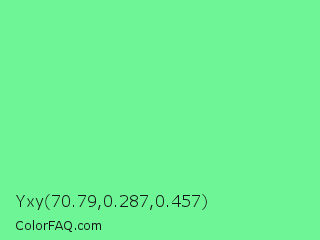 Yxy 70.79,0.287,0.457 Color is a light green color and the nearest color is Very Light Malachite Green #64e986. Hex code #6ef595 and RGB value is rgb(110,245,149). In RGB color space, this color is composed of 43% red, 96% green, 58% blue, In CMYK color space, this color is composed of 55% cyan, 0% magenta, 39% yellow , 4% black , In HSL color space, this color has a hue angle of 137° , 87% saturation and 70% lightness.