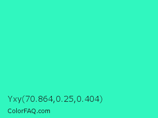Yxy 70.864,0.25,0.404 Color is a normal green color and the nearest color is Turquoise #40e0d0. Hex code #30f7bf and RGB value is rgb(48,247,191). In RGB color space, this color is composed of 19% red, 97% green, 75% blue, In CMYK color space, this color is composed of 81% cyan, 0% magenta, 23% yellow , 3% black , In HSL color space, this color has a hue angle of 163° , 93% saturation and 58% lightness.