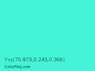 Yxy 70.873,0.243,0.366 Color is a light cyan color and the nearest color is Turquoise #40e0d0. Hex code #44f4d7 and RGB value is rgb(68,244,215). In RGB color space, this color is composed of 27% red, 96% green, 84% blue, In CMYK color space, this color is composed of 72% cyan, 0% magenta, 12% yellow , 4% black , In HSL color space, this color has a hue angle of 170° , 89% saturation and 61% lightness.