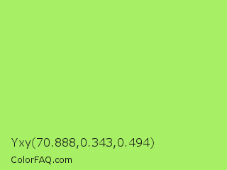 Yxy 70.888,0.343,0.494 Color is a light green color and the nearest color is Inchworm #b2ec5d. Hex code #a7ef65 and RGB value is rgb(167,239,101). In RGB color space, this color is composed of 65% red, 94% green, 40% blue, In CMYK color space, this color is composed of 30% cyan, 0% magenta, 58% yellow , 6% black , In HSL color space, this color has a hue angle of 91° , 81% saturation and 67% lightness.