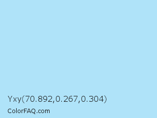 Yxy 70.892,0.267,0.304 Color is a very light blue color and the nearest color is Sail #b8e0f9. Hex code #afe3f9 and RGB value is rgb(175,227,249). In RGB color space, this color is composed of 69% red, 89% green, 98% blue, In CMYK color space, this color is composed of 30% cyan, 9% magenta, 0% yellow , 2% black , In HSL color space, this color has a hue angle of 198° , 86% saturation and 83% lightness.