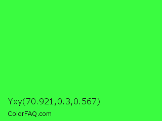 Yxy 70.921,0.3,0.567 Color is a light green color and the nearest color is Neon Green #39ff14. Hex code #3afc40 and RGB value is rgb(58,252,64). In RGB color space, this color is composed of 23% red, 99% green, 25% blue, In CMYK color space, this color is composed of 77% cyan, 0% magenta, 75% yellow , 1% black , In HSL color space, this color has a hue angle of 122° , 97% saturation and 61% lightness.