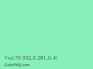Yxy 70.932,0.281,0.4 Color is a light green color and the nearest color is Algae Green #93dfb8. Hex code #87f0b8 and RGB value is rgb(135,240,184). In RGB color space, this color is composed of 53% red, 94% green, 72% blue, In CMYK color space, this color is composed of 44% cyan, 0% magenta, 23% yellow , 6% black , In HSL color space, this color has a hue angle of 148° , 78% saturation and 74% lightness.