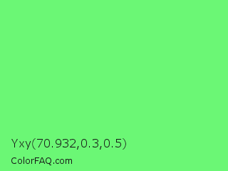 Yxy 70.932,0.3,0.5 Color is a light green color and the nearest color is Screamin Green #66ff66. Hex code #6bf775 and RGB value is rgb(107,247,117). In RGB color space, this color is composed of 42% red, 97% green, 46% blue, In CMYK color space, this color is composed of 57% cyan, 0% magenta, 53% yellow , 3% black , In HSL color space, this color has a hue angle of 124° , 90% saturation and 69% lightness.