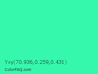 Yxy 70.936,0.259,0.431 Color is a normal green color and the nearest color is Eucalyptus #44d7a8. Hex code #36f8ad and RGB value is rgb(54,248,173). In RGB color space, this color is composed of 21% red, 97% green, 68% blue, In CMYK color space, this color is composed of 78% cyan, 0% magenta, 30% yellow , 3% black , In HSL color space, this color has a hue angle of 157° , 93% saturation and 59% lightness.